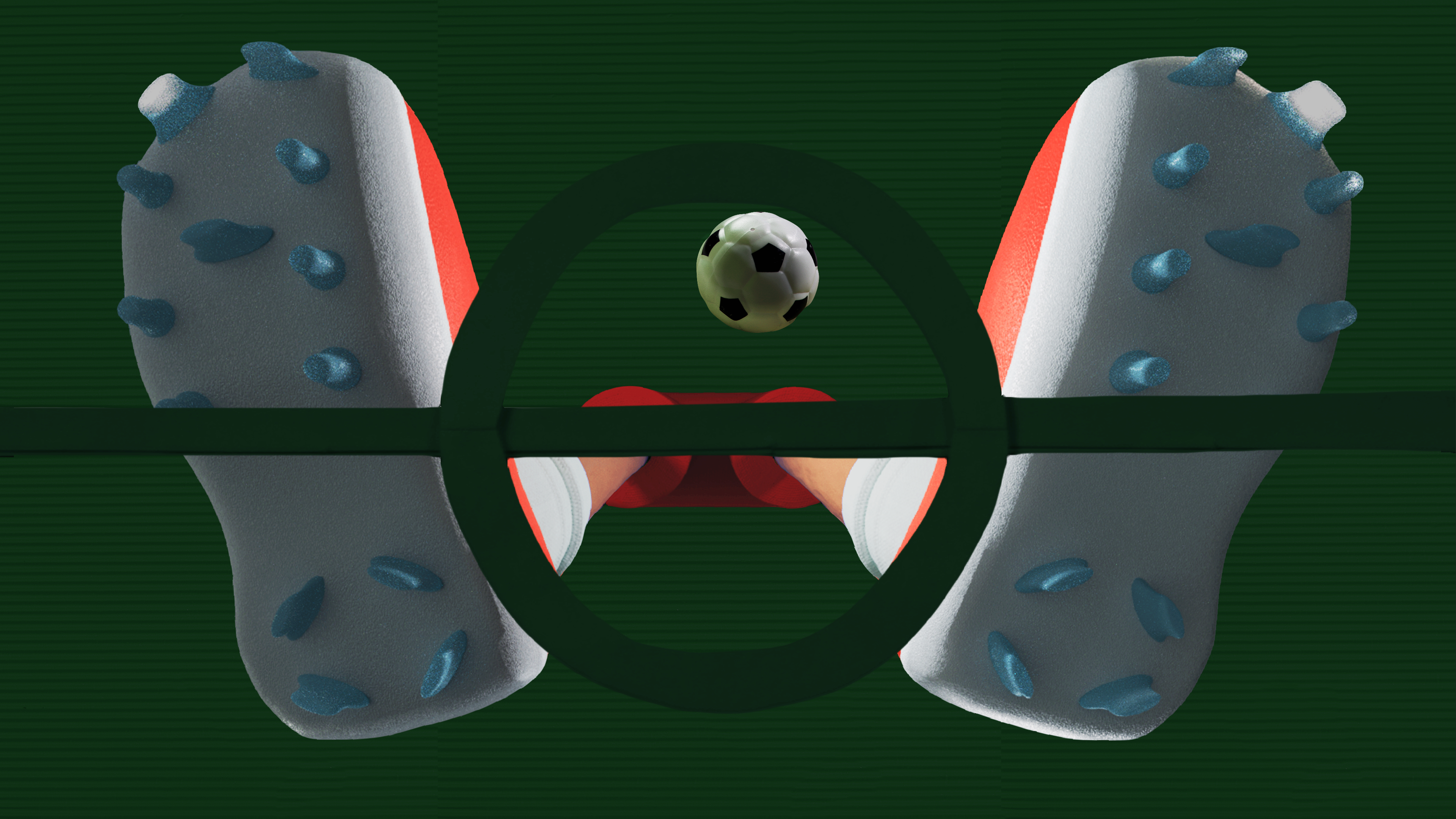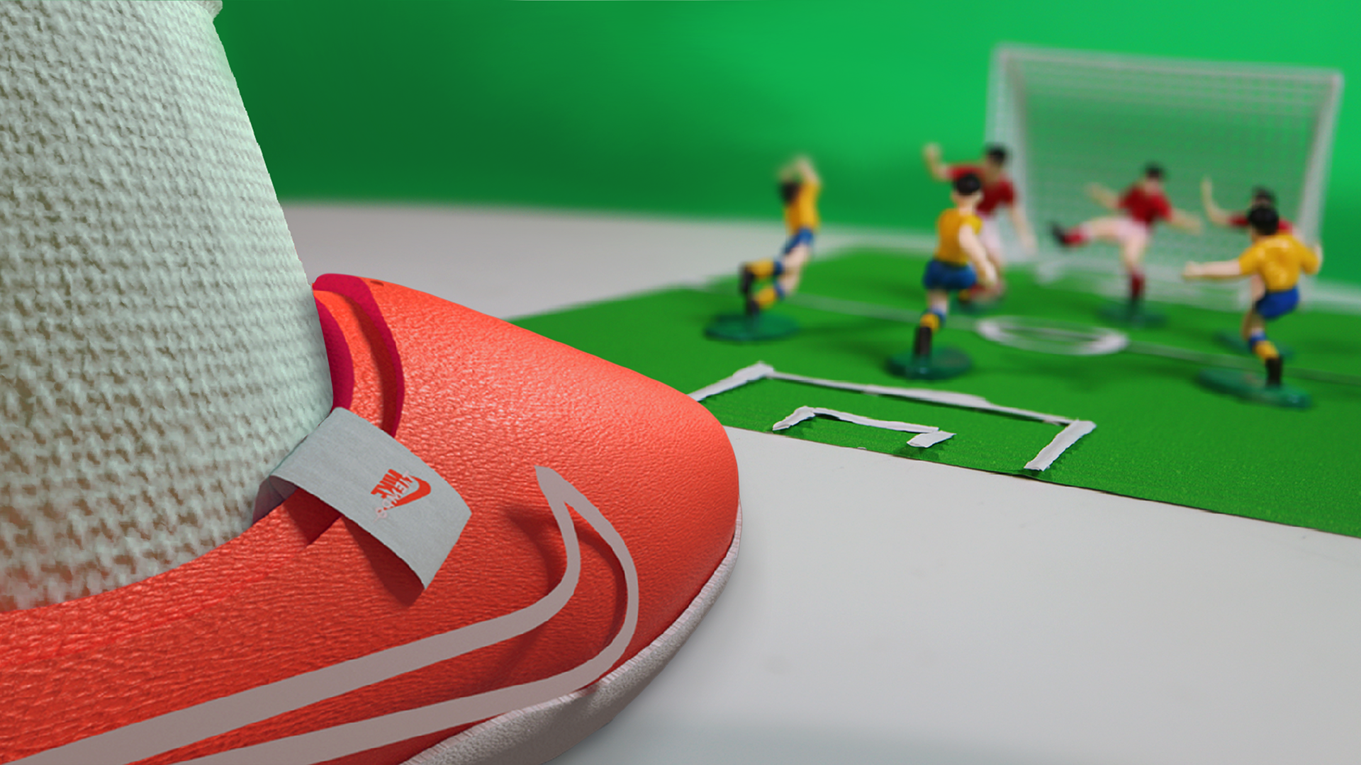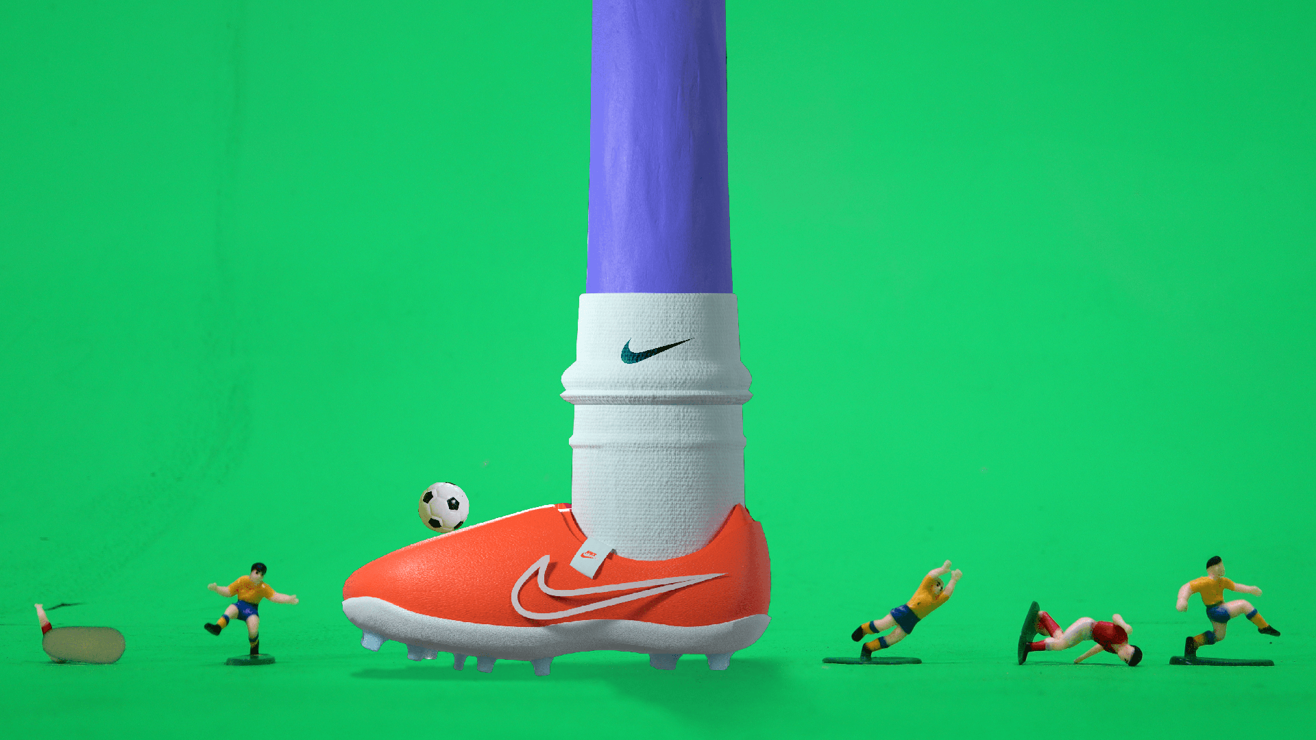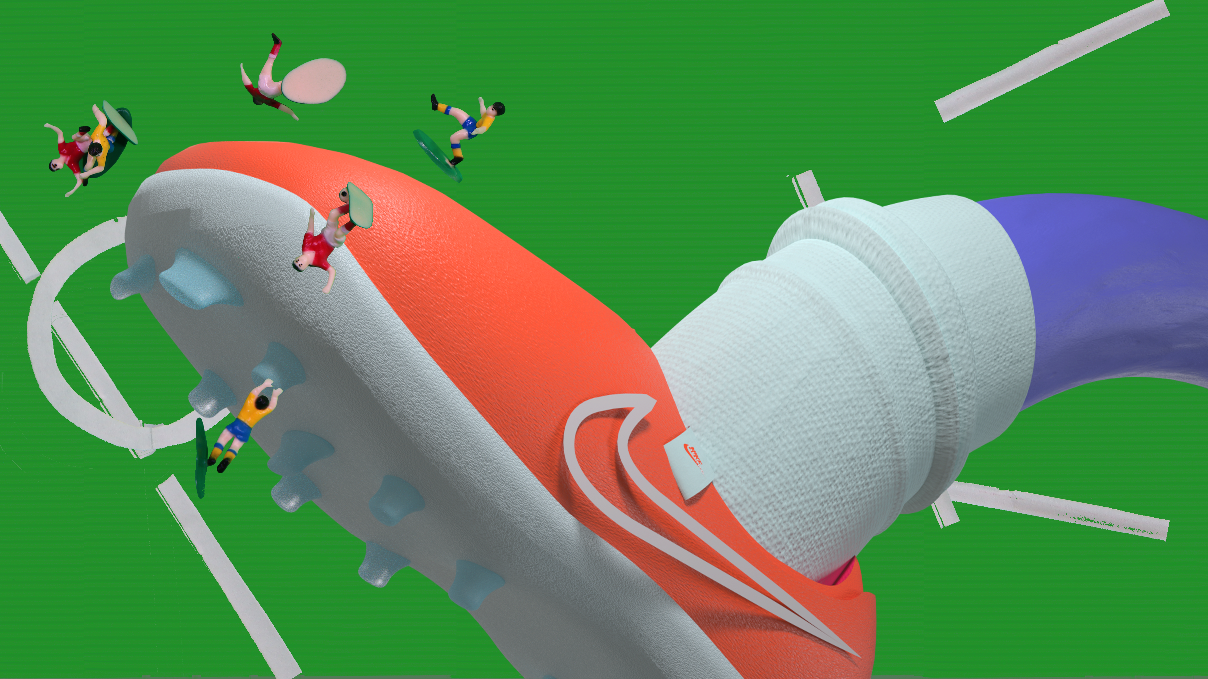 My first attempt at compositing. I combined in camera photograph of miniatures soccer figurines, a soccer field made from corrugated paper, with a 3D modeled leg wearing the NIKE Legend 10.